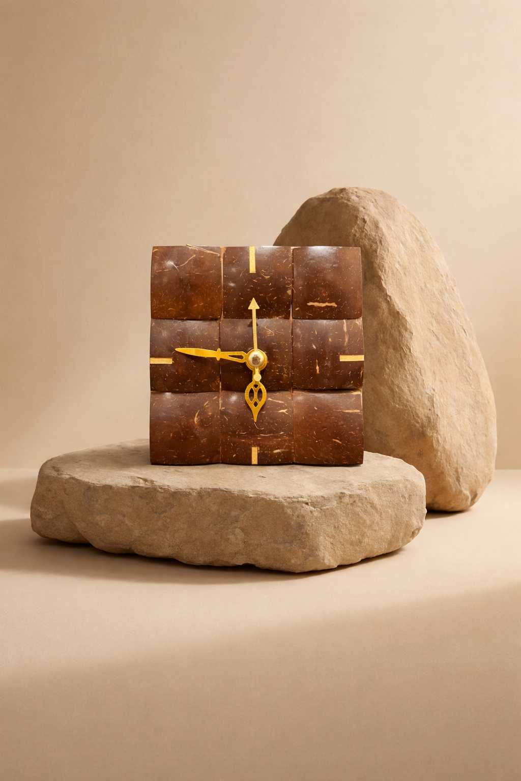 Elevate your space with this thoughtfully handcrafted table clock, made from natural coconut shell tiles and finished with elegant gold toned hands. Each clock is a celebration of sustainability, craftsmanship, and timeless design perfect for modern, earthy, or minimal interiors.