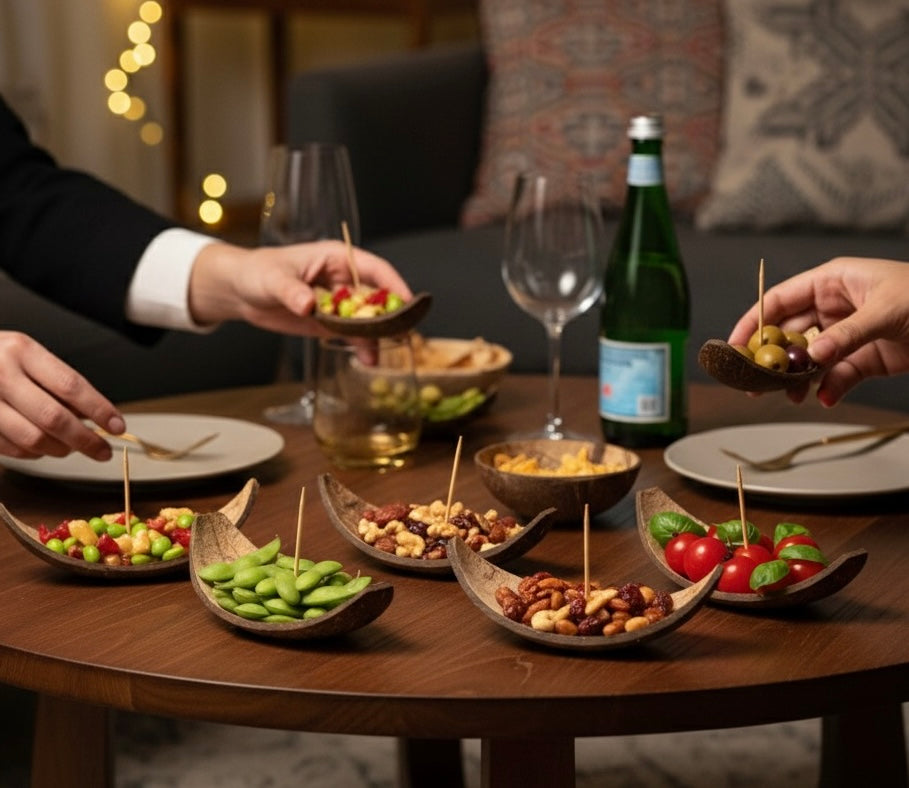 Bring a touch of nature to your dining experience with our Coconut Shell Boats, beautifully handcrafted from 100% natural coconut shells. Each serving boat is sustainably sourced and artisan-made, showcasing unique textures and organic variations that make every piece truly one-of-a-kind.